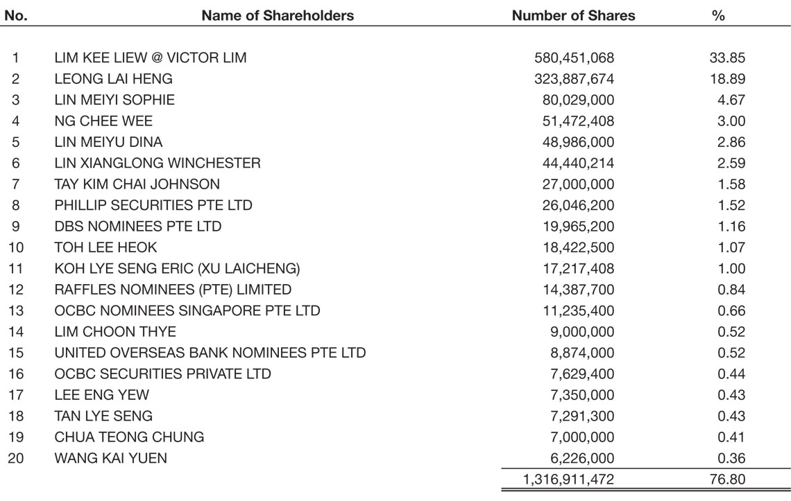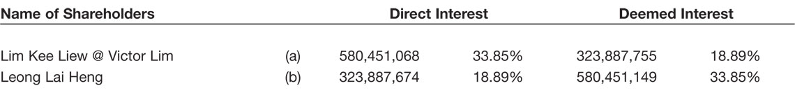 1. Mr. Lim Kee Liew @ Victor Lim’s deemed interest arose through 5 shares held by Ultraline Technology (S) Pte Ltd and 76 shares held by American Converters Industries Pte Ltd. He is also deemed to have an interest in the 323,887,674 shares held by his spouse, Mdm. Leong Lai Heng.